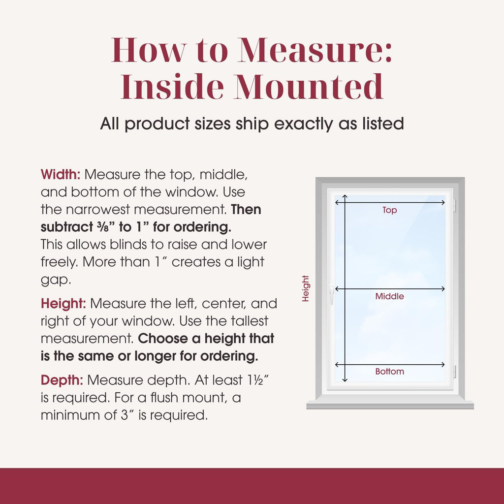 • For inside mount, please order a blind that is at least 3/8 inch smaller than the width of your window. The width listed here is the exact width, do not include the mounting hardware width, the mounting hardware will add 3/8 inch more width. If you need inside mount and your inside window width is 35 inch, please order a blind less than 34 5/8 inch.